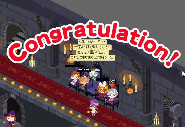 アメピグ-ハロウィンイベント楽しい アメーバッピグッ☆(ゝω・)v キャピッ 久しぶりにログインしてみたらハロウィンイベント中! 何となく参加してみました。 エントリー! 右上のメガネがワタクシです。 こんな感じで骸骨に当たると真ん中の牢屋に閉じ込められてしまいます>< 鍵を5個集めればクリア! 活躍出来ればこんな風に褒めてもらえます! \殊勲賞/ クリアすると次のフロアへ進めて、もっと難しくなるよ! \最終フロアクリアー/ 関連する日記 PR